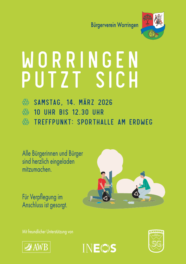 Danken möchte ich unseren Unterstützern, den AWB, der Ineos und der Sportgemeinschaft Worringen, die wiederum ihren Parkplatz zur Verfügung gestellt hat. Ihnen gilt ebenso unser herzlicher Dank, wie allen Helfern, besonders der großen Gruppe der Jugendfeuerwehr, die alle zusammen unser Ort wieder sauberer gemacht haben.“